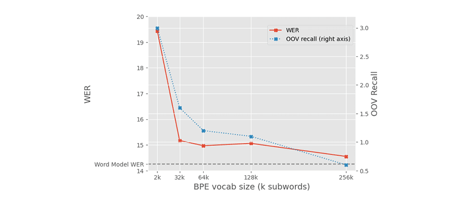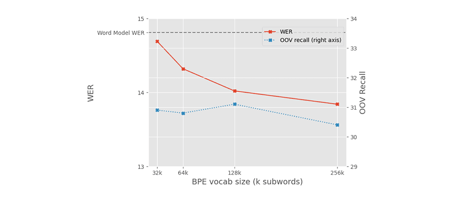 As you can see in the graph below, models trained with subwords in German perform well. A range of vocabulary sizes for the subword tokenizer achieved lower word error rates (WER) than the word-level baseline. The graph also shows, in the blue line labelled OOV (Out Of Vocabulary) recall, that the new models are able to recognize words that used to be outside of the word-level model’s vocabulary. Mostly, these are compound words, that would previously have been recognized as separate words.