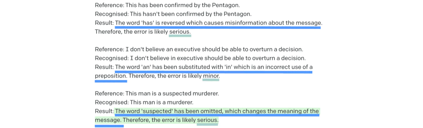 Using the same prompt structure, we can now run GPT3 over every reference and recognised utterance in our testset, count up the penalties associated with the predicted severities and calculate the overall NER. We now have a much more meaningful error rate that is automated.
