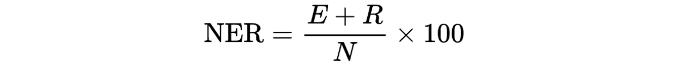Not to be confused with “Named Entity Recognition”, the NER model is an alternative way of evaluating speech-to-text. With this model, as a human goes through the transcript and fixes the mistakes, they assign a penalty that weights the severity accordingly. To calculate NER, you count the number of words (N), find the sum of edition error penalties (E) and the sum of recognition error penalties (R). This is where the name NER comes from.